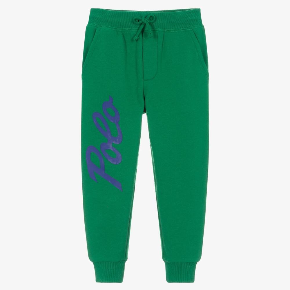 Green joggers for boys by Ralph Lauren, made from super soft cotton jersey. Comfortable on casual days, these joggers have an adjustable drawstring waist and side seam pockets. For a signature look, they have a blue script logo printed on the front, with the brand's small pony logo embroidered on the blue back pocket.