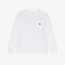 Ivory long-sleeved top for boys by Ralph Lauren, made in soft cotton jersey. Casual and comfortable, it has a stand-up collar with a 1/2 zip fastening and a split hem for ease of movement. The brand's signature Pony logo is embroidered on the chest for a distinctive finish.