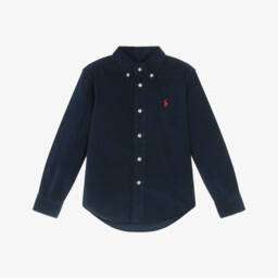 Navy blue shirt for boys by Ralph Lauren, made in soft cotton needlecord. For casual styling in an autumnal colourway, it features a button-down collar and the brand's iconic Pony logo embroidered on the chest in red.