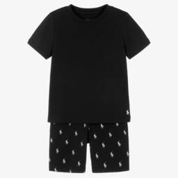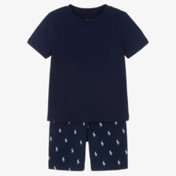Navy blue short pyjamas by Ralph Lauren, offering a stylish and comfortable nightwear option for boys. Made from soft cotton jersey, the set includes a plain top with an embroidered Pony logo and patterned shorts adorned with the same logo in a white design. The breathable fabric is ideal for a good night's sleep, while the elasticated, drawstring waistband provides an adjustable fit and ease of wear.