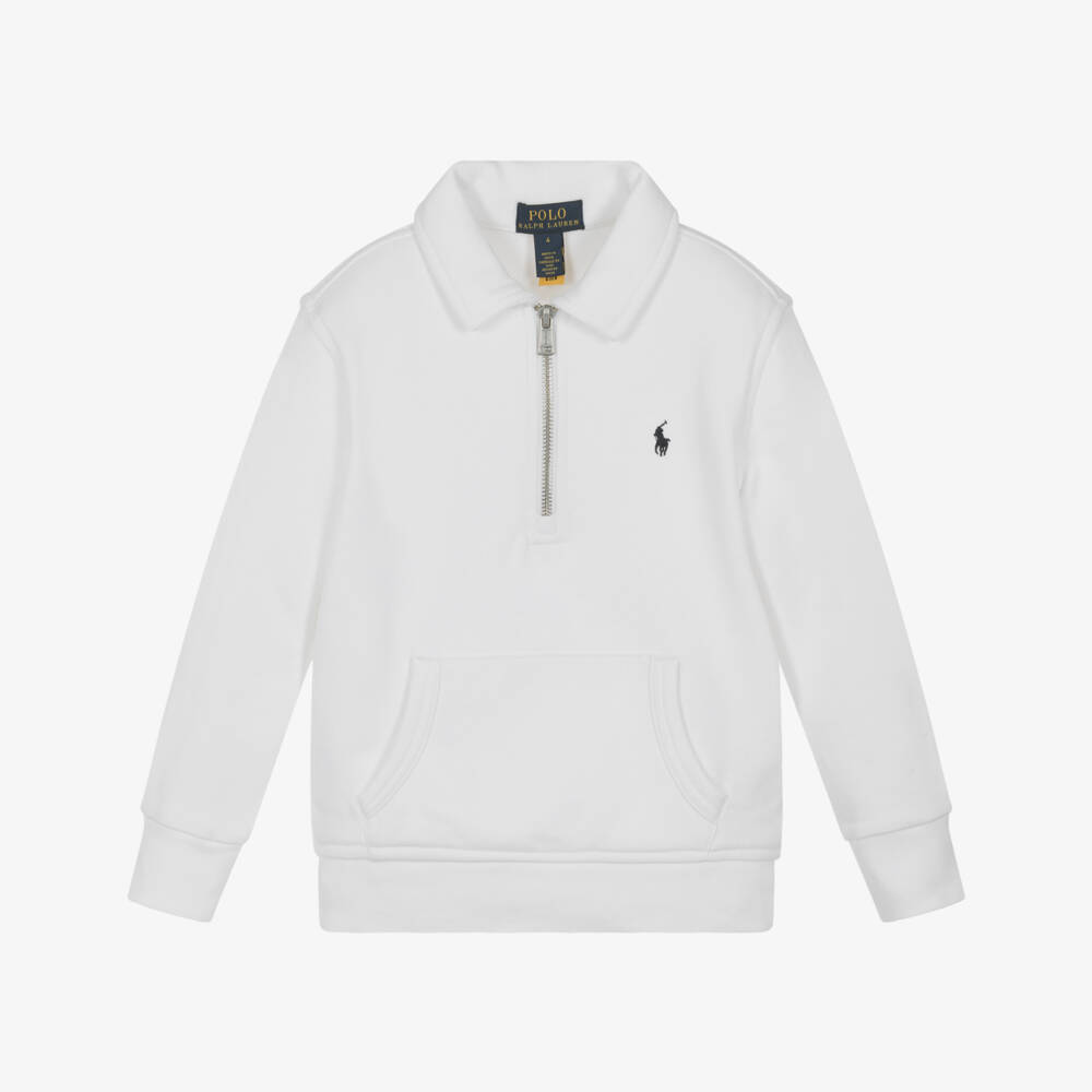 White half-zip sweatshirt for boys by Ralph Lauren, made in soft cotton jersey. This casual, layering piece has a front patch pocket and the brand's signature pony logo embroidered on the chest in navy blue.