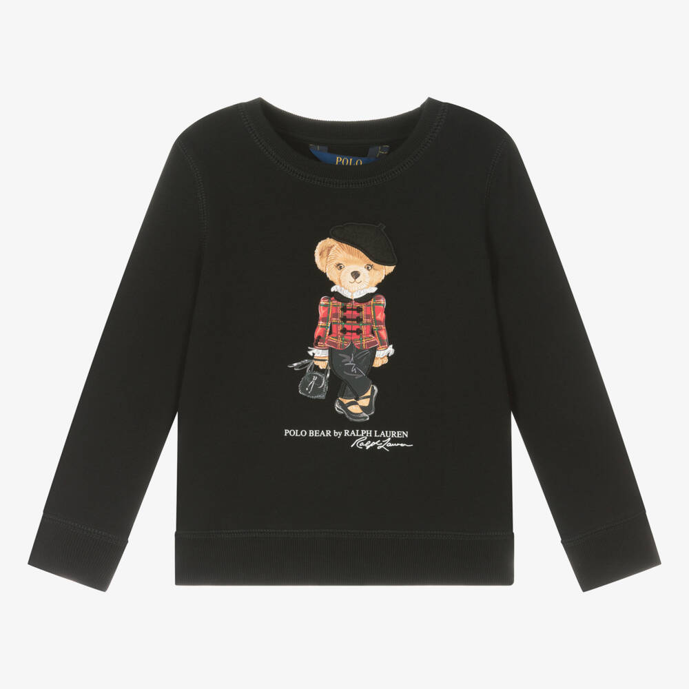 Casual black sweatshirt for girls by American brand Ralph Lauren, with the designer's signature Polo Bear printed on the front, wearing a Parisian-inspired look in a black beret with a red tartan jacket. It is made in comfortable cotton-blend jersey, with overstitch detailing, ribbed trims and a fleecy inside for cosiness.