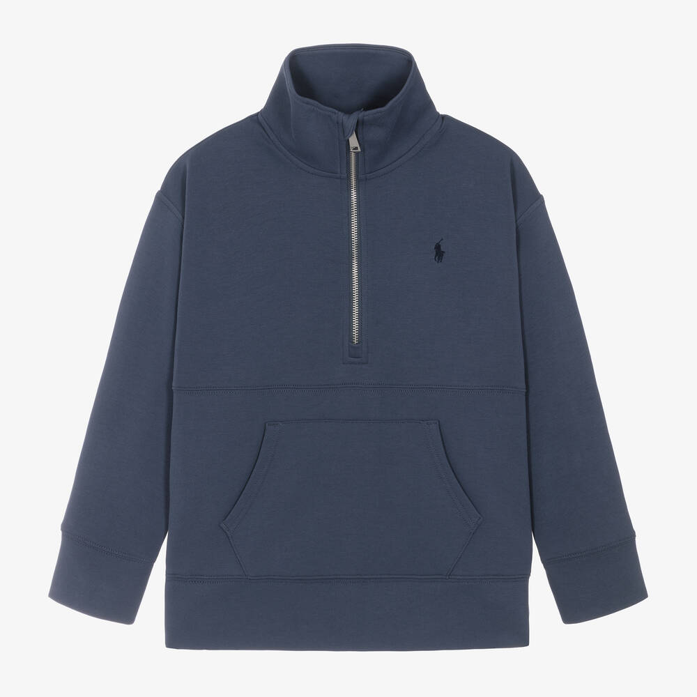 Navy blue cotton jersey zip-up top for girls by Ralph Lauren. Relaxed and comfortable, it has a stand-up collar with a half zip fastening and a useful pouch pocket on the front. Zips on the side seams can be opened for ease of movement. The brand's signature pony logo is embroidered in tonal blue on one side.