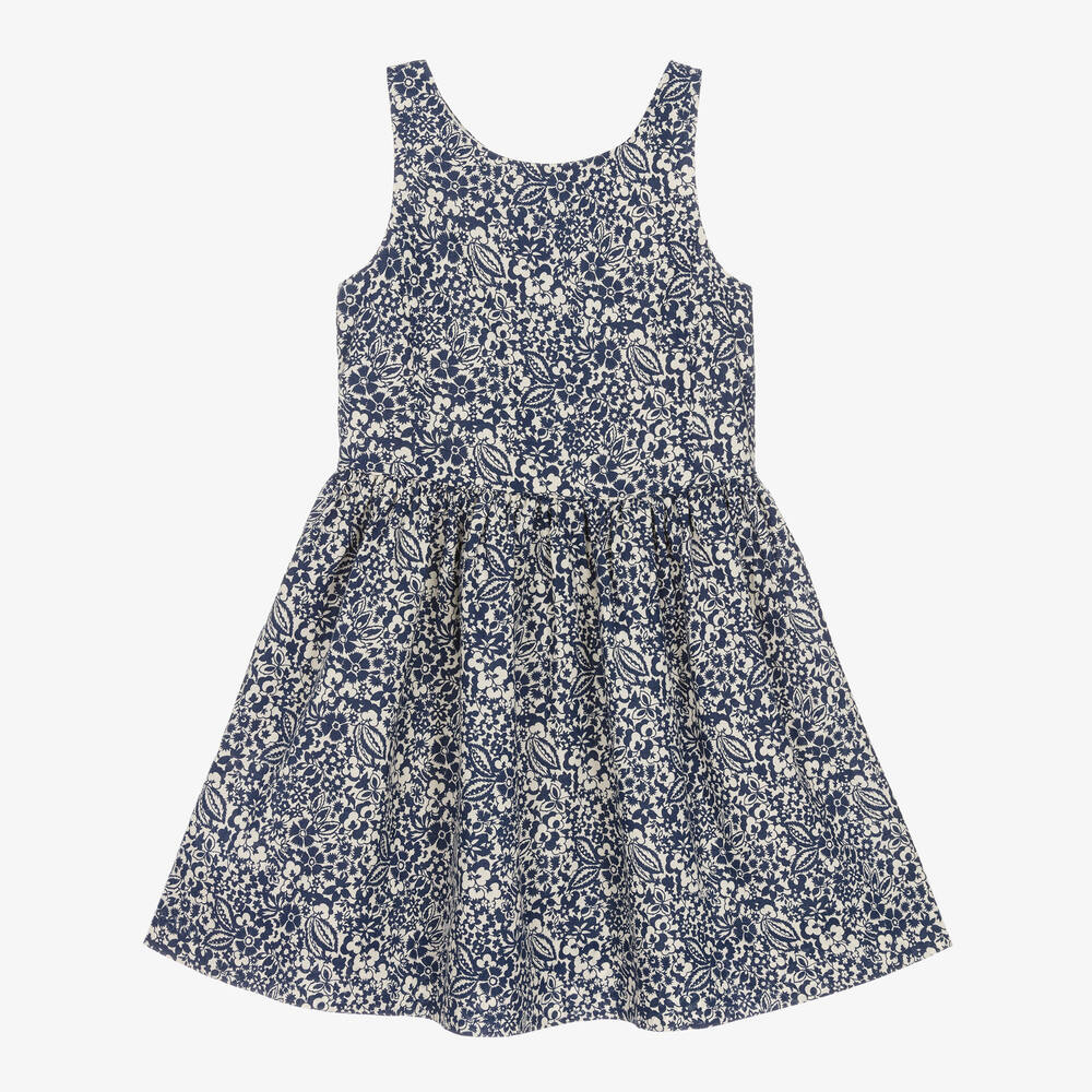 A pretty navy blue and ivory dress for girls by Ralph Lauren, made in soft and lightweight cotton. This dress is patterned in a floral design, with a flared skirt and neat fabric-covered button fastenings on the back.