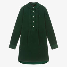 Navy blue cotton turtleneck dress for girls by American brand Ralph Lauren. The jersey bodice has pretty, curly-edged trims and the label's signature embroidered pony logo on one side. The poplin skirt has a pink and green floral print and a ruffled hem. Easy to wear, the dress simply pulls on.