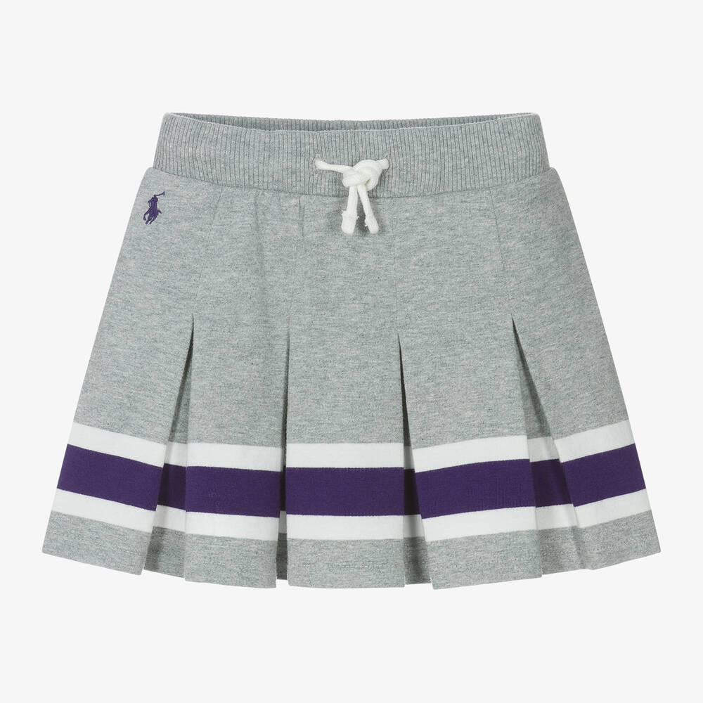 Preppy grey marl cotton skort for girls by American label Ralph Lauren, with purple and white stripes around the hemline. It is made in soft, stretchy, pleated jersey with useful, attached, lightweight jersey shorts below. There is a drawstring waistband for an ideal fit, and the brand's signature pony logo is embroidered in purple on one side, adding a subtle designer touch.