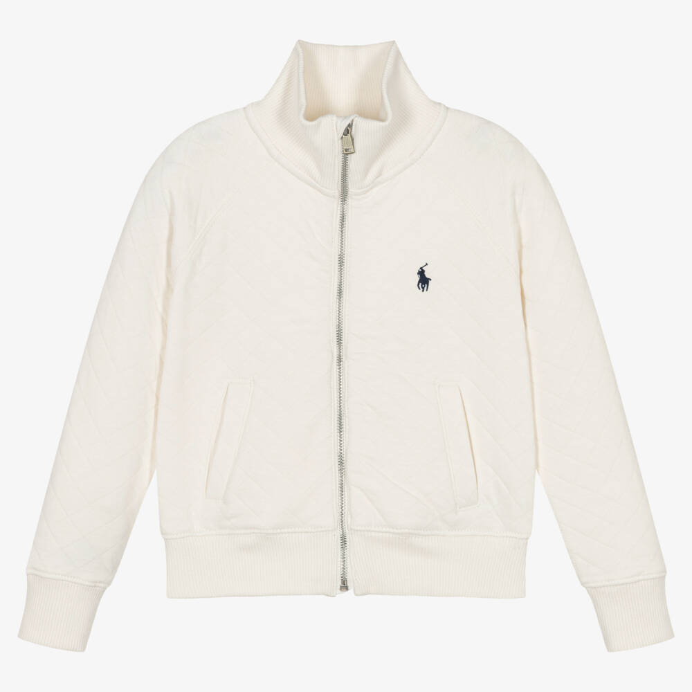 Casual ivory zip-up top for girls by Ralph Lauren, made in a soft cotton blend with an all-over diamond pattern. There are useful pockets on the front, with a high ribbed collar and raglan sleeves for a sporty look. The brand's signature pony logo is embroidered on the chest in navy blue.