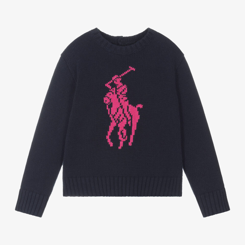 Navy blue sweater for girls by Ralph Lauren, knitted in soft cotton for comfort and warmth. It has a casual crew neckline and a bright pink intarsia-knit pony logo on the front for a distinctive designer finish.