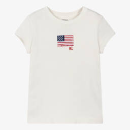 This navy blue cotton T-shirt for girls by Ralph Lauren captures a sense of classic American style. Made in soft jersey, it features a historical American flag and RL logo embroidery on the front.
