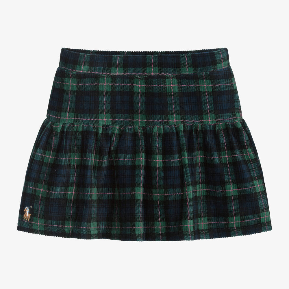 A beautiful tartan skirt for girls by Ralph Lauren, designed in a stylish navy blue and green check. Made in soft corduroy jersey, this easy-to-wear style has a full skirt and a comfortable elasticated waistband. The brand's signature pony logo is embroidered just above the hem for designer appeal.