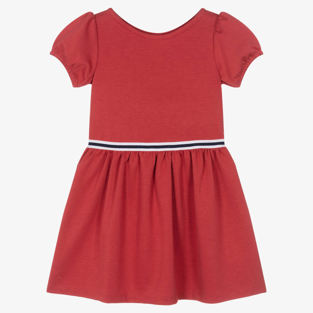 Dark red dress for girls by Ralph Lauren. Soft and stretchy, it is made in soft cotton jersey and has capped short sleeves and a stretchy waistband in navy blue and white and pulls on over-the-head.