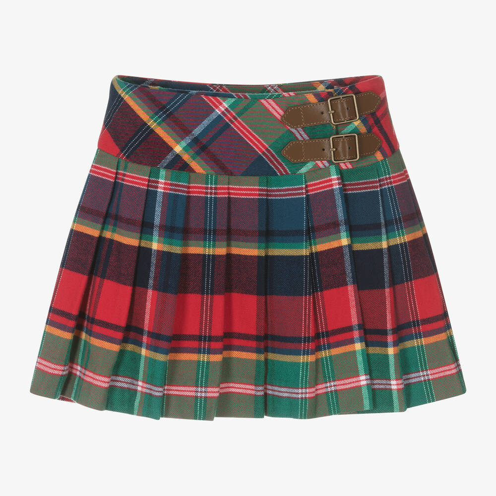 A stylish red, green and blue tartan skirt for girls by Ralph Lauren, made in softly brushed cotton twill. This pleated, wrap-over style, has faux leather buckles on the front for a traditional look. It fastens with a concealed hook and eye and has an adjustable waistband for a comfortable fit.
