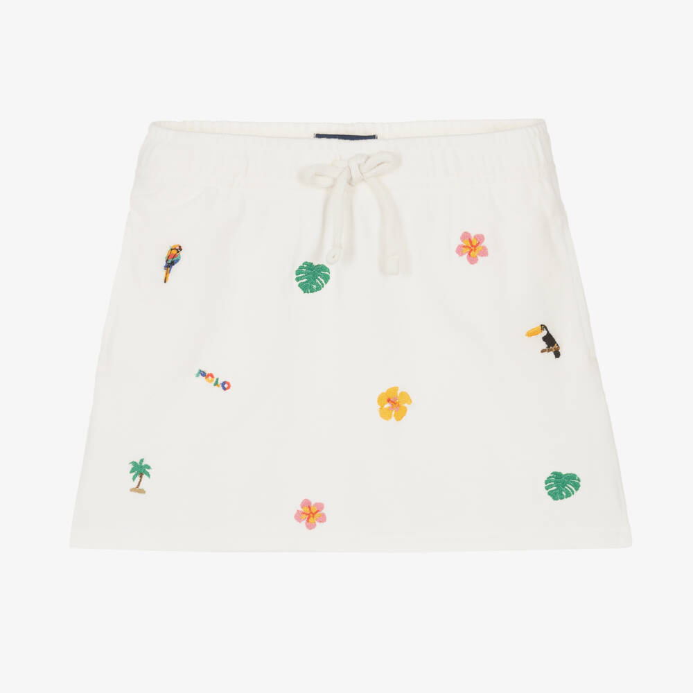 White cotton skirt for girls by American brand Ralph Lauren, patterned with colourful, holiday-inspired embroidery such as parrots, flowers and palm trees, with the Polo logo. Just right for relaxed days, it is made in comfortable piqué and has a stretchy, elasticated waistband with a bow. There are useful, concealed pockets on the sides.