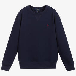 Navy blue cotton sweatshirt for teen boys by American brand Polo Ralph Lauren. As seen in the main collection, it has the brand's signature pony logo embroidered on the front in red. This casual top is made in comfortable jersey with a cosy, fleecy inside and ribbed trims, ideal for relaxed days.
