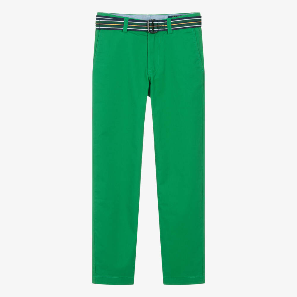 Green cotton chinos for teen boys by American brand Ralph Lauren, ideal for a smart-casual look. Made in comfortable twill, they come with a detachable, adjustable, grosgrain belt striped in green and navy blue. With subtle branding, they have the designer's signature pony logo embroidered in navy blue above one of the buttoned back pockets. They have useful, slanted side pockets and fasten with a front button and zip.