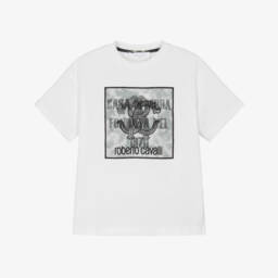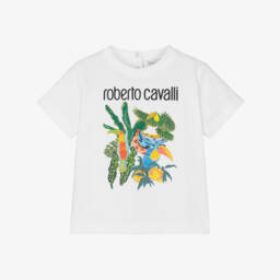 Off-white cotton T-shirt for little boys by luxury Italian label, Roberto Cavalli, with a fun and intricate backpack design. The playful print is detailed with logo motifs, including the distinctive RC Monogram, for instant designer appeal. Made in comfortable jersey, the T-shirt has branded popper fastenings on one shoulder to help with dressing.