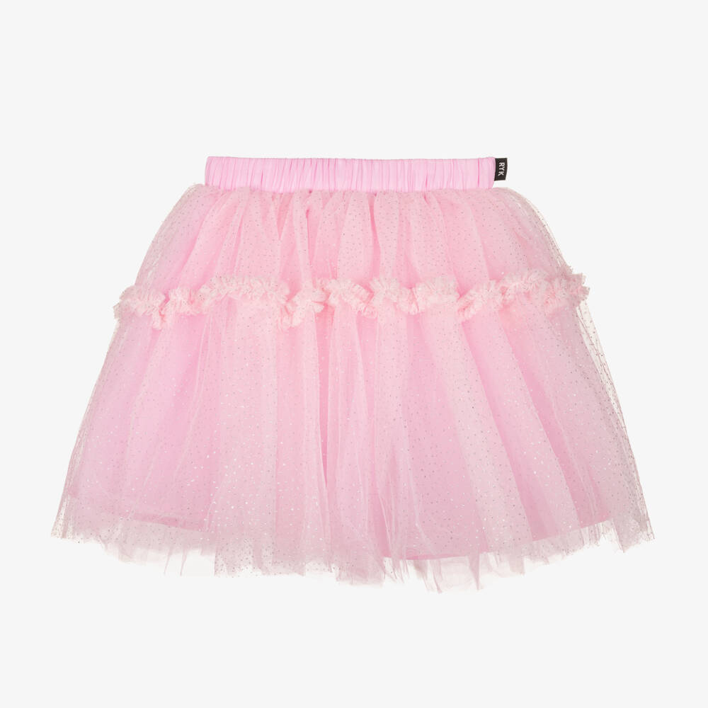 Great for parties, this delightful pink tulle skirt for girls by Rock Your Baby is covered in pretty silver sparkles. Lined in soft and breathable cotton voile, this skirt has a lovely ruffle trim and a voluminous tutu silhouette. There is a black logo tab on the ruched elasticated waist for a comfortable fit.