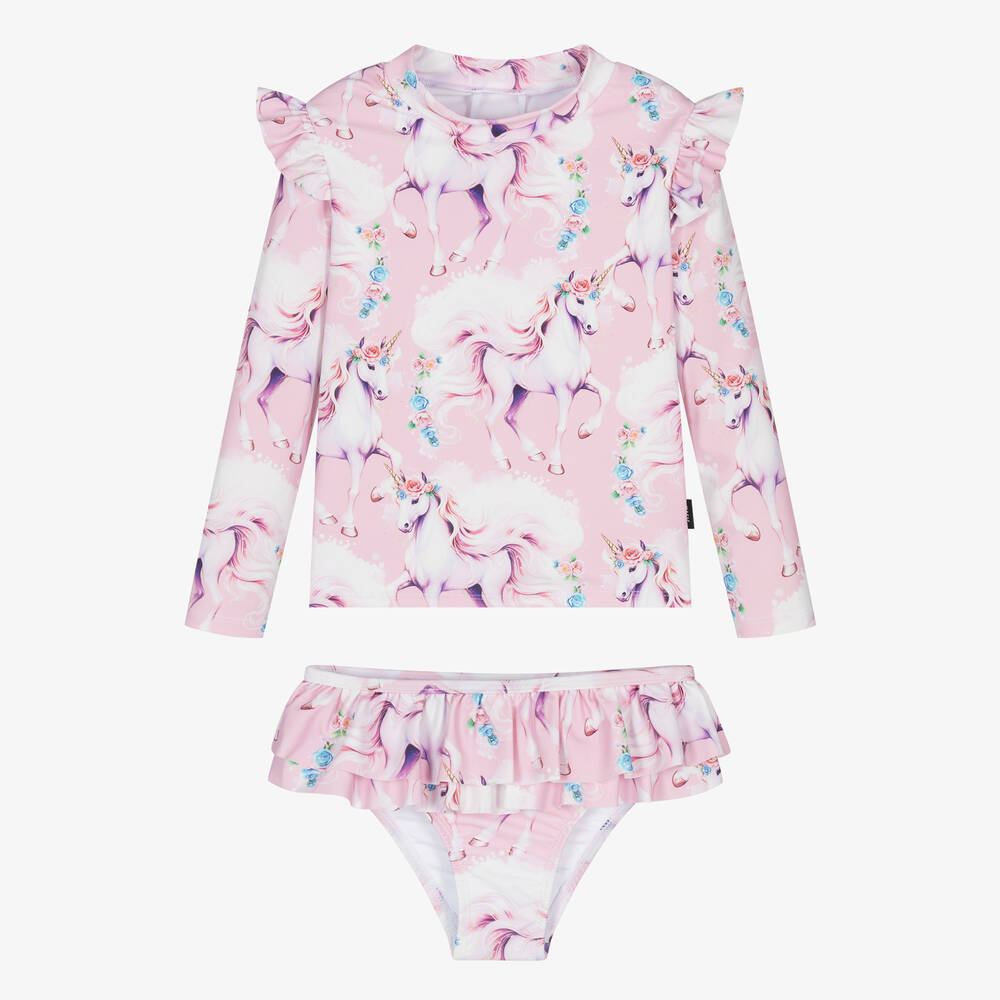 Pretty pink tankini for girls by Rock Your Baby, with a magical unicorn and floral pattern. It is made in a silky smooth and stretchy fabric with UPF 50+ and fully lined for comfort. The top has a high neckline and long sleeves, with a frilled trim on the shoulders. The matching bikini bottoms have tiered ruffles trimming the gently elasticated waistband. This product contains recycled fibres.