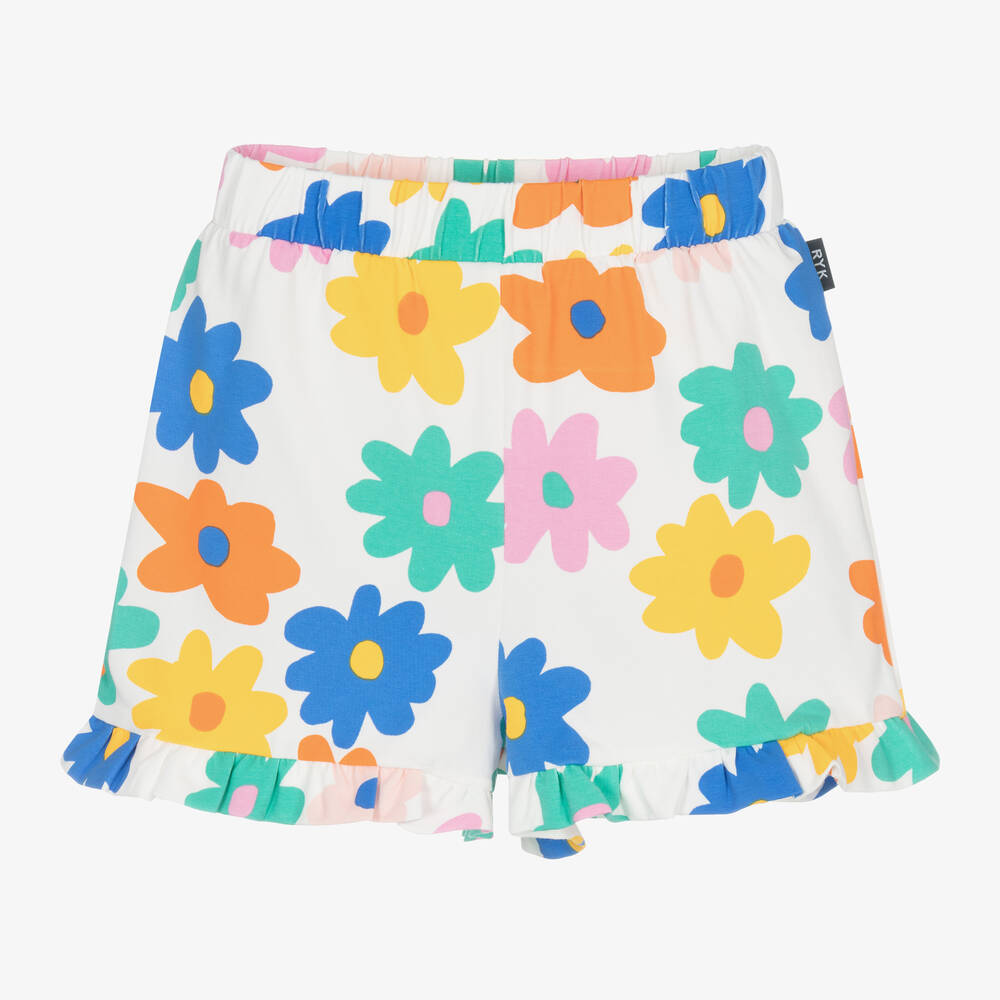 Casual yet comfortable white cotton shorts for girls by Rock Your Baby. They easily pull on with an elasticated waist and are patterned with multicoloured abstract flowers for a fun finish.