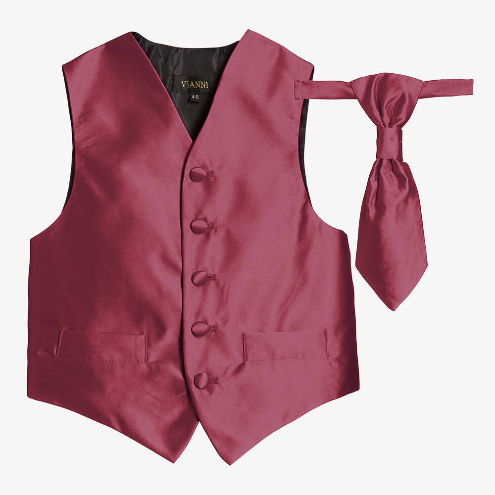 Boys burgundy red satin waistcoat and adjustable tie set by Romano Vianni. Made in a smooth silky fabric, this classic style waistcoat has covered buttons, two faux front pockets and a contrasting back panel in black with adjustable buckle. The matching cravat style tie is ready made and has an adjustable neck strap.