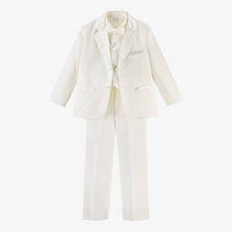 Boys ivory special occasion tuxedo suit by Romano. This elegant suit comprises a jacket, elasticated waist trousers, pintuck shirt, bow tie and waistcoat. The jacket has satin lapels, pockets and covered buttons. The trousers fasten with a button and have an elasticated waistband, with satin stripes down each side.
