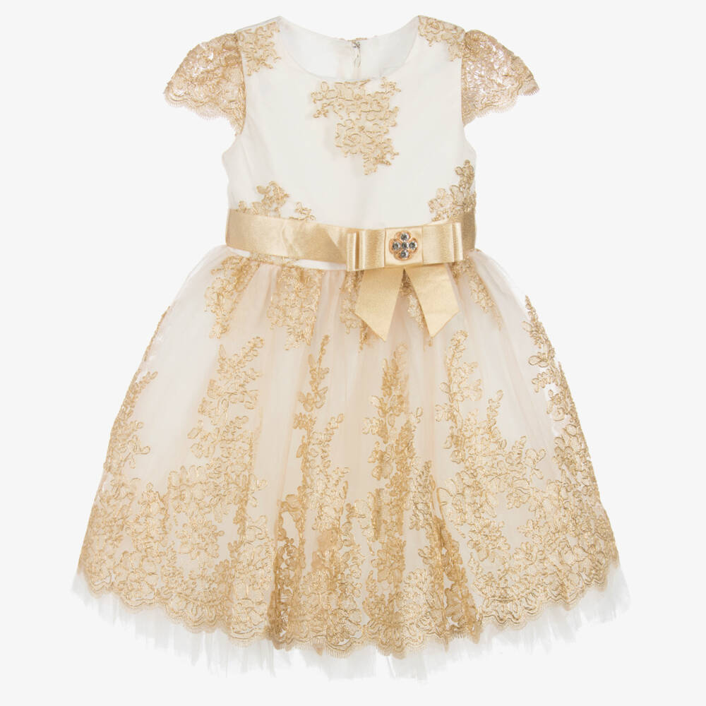A lovely ivory and gold dress set for girls by Romano. Made from beautiful gold embroidered lace with pretty capped sleeves, this dress has underlayers of tulle for extra volume. Fastening with a concealed zip, the attached gold sash with a sparkling jewelled bow embellishment ties neatly on the back. Smaller sizes come with a frilled headband, and larger sizes come with a coordinating bag.