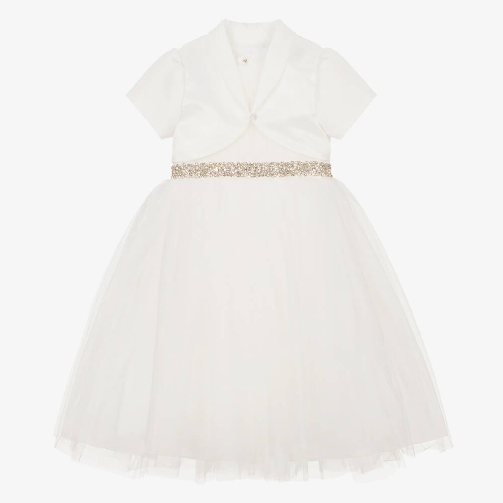 An elegant, pale ivory special occasion dress set for girls by Romano. The sleeveless bodice has subtle vertical pleats and a beautiful diamanté trim on the waist for an added touch of sparkle. The voluminous tulle skirt has a firm netted underlayer and silky soft lining to enhance the dramatic silhouette. Fastening with a concealed zip and hook, it has a satin sash that ties into a bow on the back. To complete the smart look, it comes with a cropped satin tuxedo-style bolero that fastens with a hook on the front.