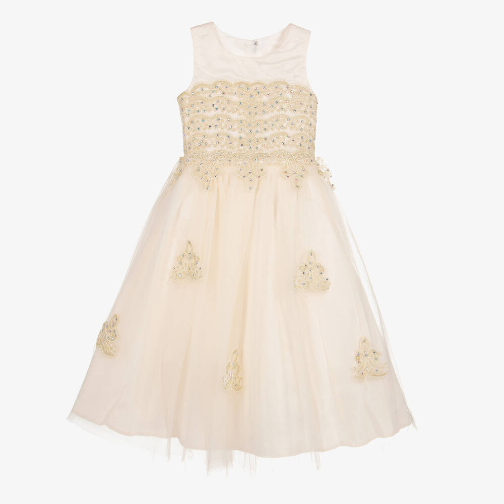 A special dress for girls in peach pink by Romano Princess. The tulle bodice and skirt are embroidered with sparkling gold lace and crystals. There is zip fastening on the back with a pretty satin back bow adding an elegant touch.