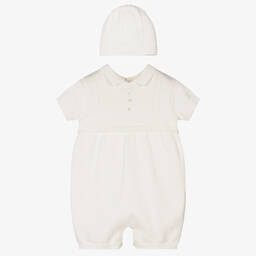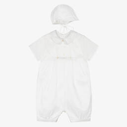 Traditionally styled, pale blue babysuit and hat set for boys by Sarah Louise. This charming set is made in soft, lightweight cotton-blend poplin, beautifully hand-smocked and hand-embroidered with tonal blue and white detaiing. The long-sleeved romper has a rounded collar, decorative side tabs, cuffed legs and button fastenings. The matching cap is elasticated on the back and has a detachable strap to fasten under the chin.