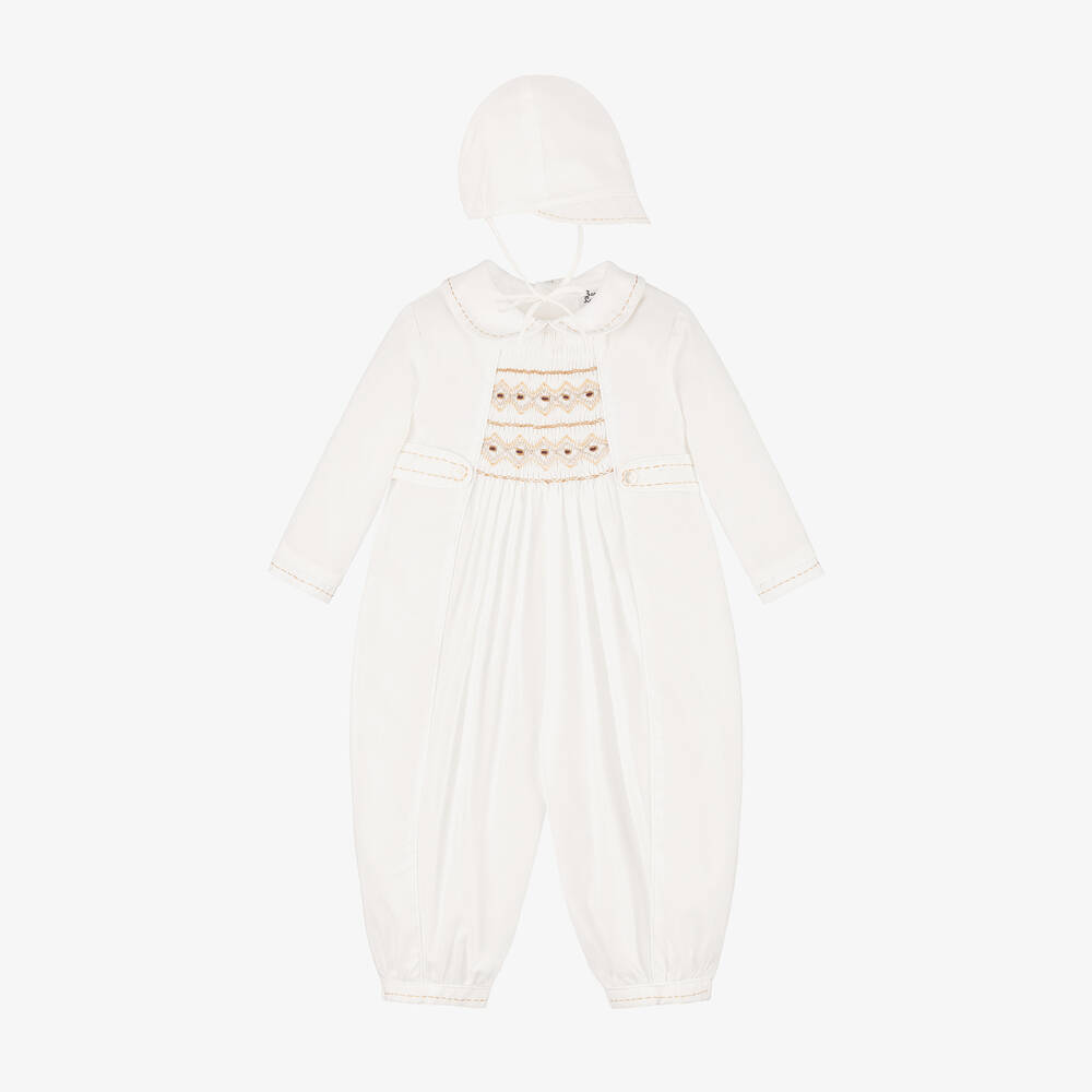 Traditionally styled ivory babysuit and hat set for boys by Sarah Louise. This charming set is made in soft, lightweight cotton blend poplin, beautifully hand-smocked and hand-embroidered with contrasting beige and yellow detailing. The long-sleeved romper has a rounded collar, decorative side tabs, cuffed legs and button fastenings on the back and be tween the legs. The matching cap is elasticated on the back and has a detachable strap to fasten under the chin.