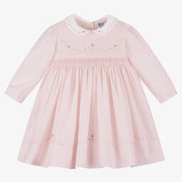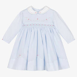 Designed by British brand Sarah Louise, this light blue dress for little girls is woven in a beautifully soft cotton blend. Hand-embroidered with gorgeous floral details, it has a sweet rounded collar, puffed sleeves and a flared skirt. The waistband is delicately hand-smocked for a traditional look. Fastening with buttons on the back, it has a lightweight woven lining for comfort on little ones' delicate skin.
