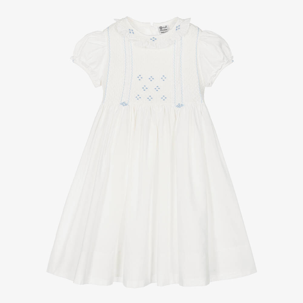 Lovely ivory dress for little girls by classic British brand Sarah Louise, made in a lightweight cotton blend. Traditionally styled, it has hand smocking and pale blue hand-embroidered flowers across the bodice with little pintucks. The hand-smocked collar and pretty puffed sleeves both have matching floral embroidery. It is fully lined in voile for comfort and has pearlescent button fastenings around the back, with a sash that ties in a bow on larger sizes.