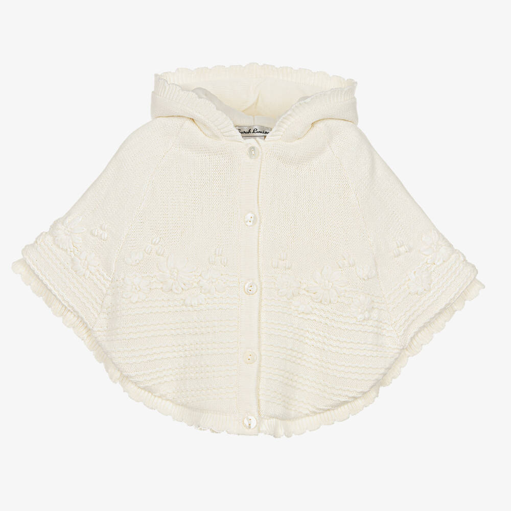 Gorgeous ivory hooded cape for younger girls from Sarah Louise, made in a soft knit and decorated with pretty hand-embroidered flowers. This cosy cape has a finely knitted lining and is gently padded for added warmth. It has a lovely scalloped trim and fastens on the front with pearlescent button fastenings. Concealed poppers on the arm can be fastened to create wide, raglan sleeves.