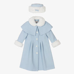 A lovely pale pink and ivory coat set for little girls by British designer Sarah Louise, lined with silky satin. This traditional design is made in a beautifully soft, brushed viscose blend with smart mother-of-pearl front button fastenings, a pretty bow on the back and plush faux fur trims. It is gathered and pleated on the front and back for a feminine silhouette. Versatile and classically styled, the matching cape is removable, attaching with a front button. A sweet pink and ivory hat with a little bow completes this timeless set.