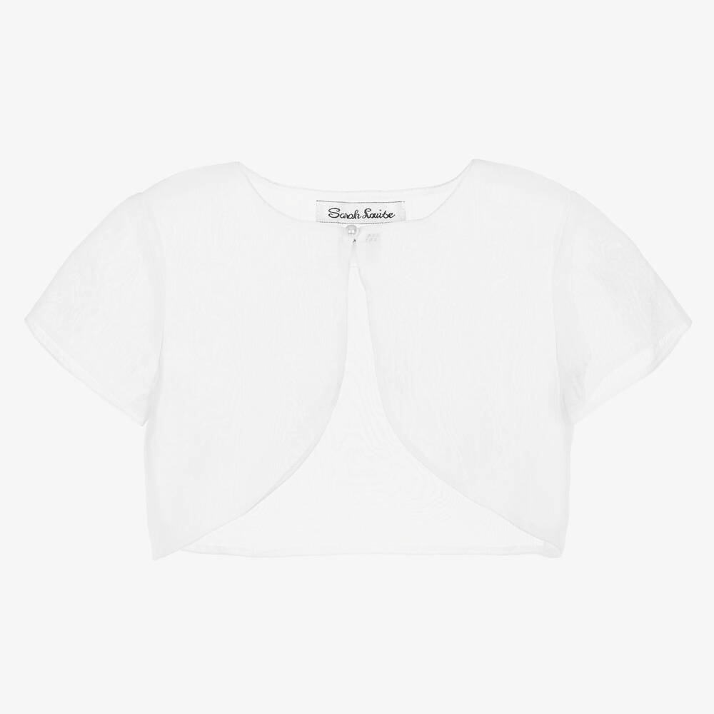 Girls white organza bolero by Sarah Louise. Sheer and lightweight, this pretty cropped top adds a lovely finishing touch to an outfit. There is a delicate pearl effect button fastening on the front, and a tulip-shaped opening.