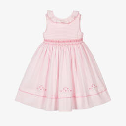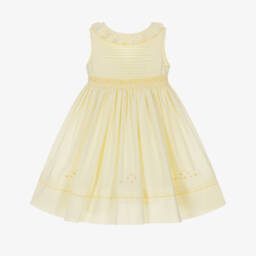 Exclusive to Childrensalon, a lovely yellow dress for girls by Sarah Louise, with hand-smocked and hand-embroidered detail for a traditional look. Made and lined in a lightweight cotton blend, this sleeveless style has a ruffled collar and charming pintucks on the bodice and around the hem. A V-back with button fastenings and a pretty sash tie complete the look.