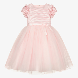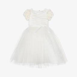 Lovely ivory special occasion dress for girls by British brand Sarah Louise. The bodice is made in sumptuous pleated satin and has sleeves embellished with floral appliqués and little pearl beads. The full, gathered ivory satin skirt has overlays of white tulle, with an ivory satin ribbon waistband and a bow around the back. It fastens with a zip that is covered with decorative satin-covered buttons. There is a net frill on the satin lining for extra volume.