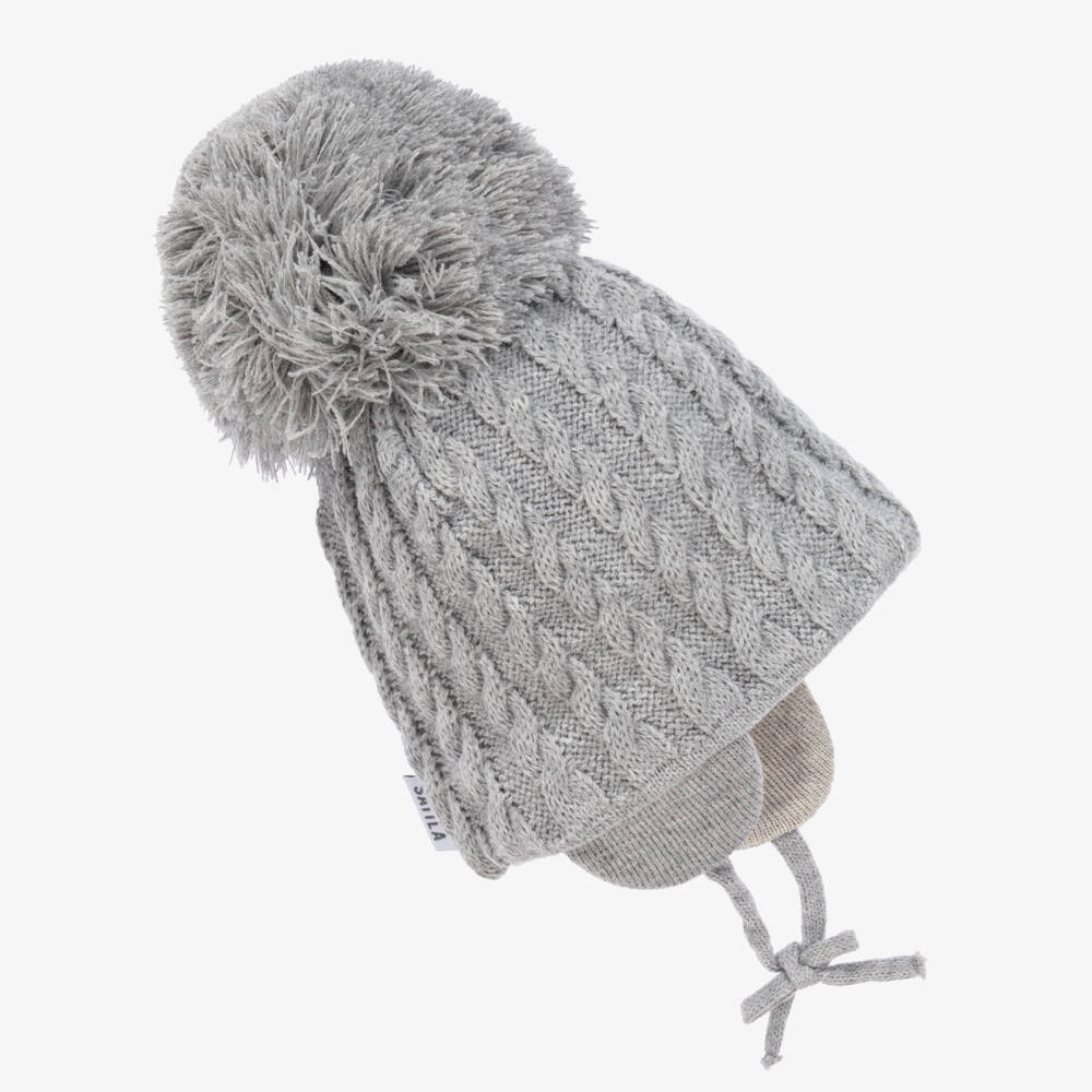 A grey beanie for little boys and girls by Sätila of Sweden, in a lovely cable knit design. It has a giant pom-pom decoration and ear flaps with ties that secure under the chin to keep them super cosy. For extra comfort and warmth, the hat is lined in soft cotton jersey.