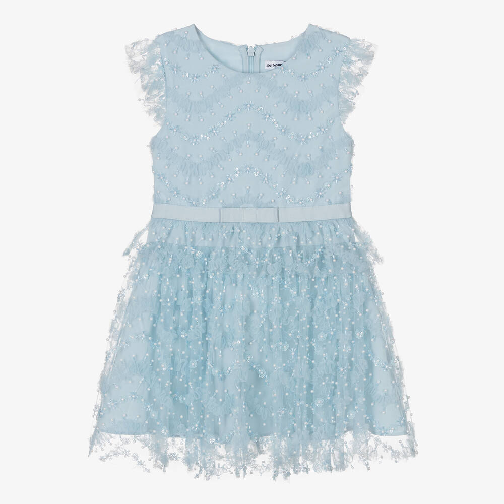 Girls will sparkle and shimmer in this beautiful ice-blue dress by Self-Portrait. Renowned for their attention to detail, the designer has styled this tulle dress with carefully placed sequins, faux pearls, tulle ruffles, and beads. Soft, lightweight crêpe lines the dress for comfort and a grosgrain bow sits neatly on the waist. It fastens with a concealed zip on the back.