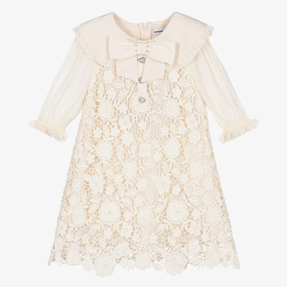 Chic ivory dress for girls by Self-Portrait, crafted in luxuriously soft chiffon. Embroidered with vintage-style guipure lace, it has a romantic frilled collar and puffed sleeves. Lined in silky satin, it has a fixed oversized chiffon bow on the neckline and sparkling diamanté heart buttons for a glamorous finishing touch.
