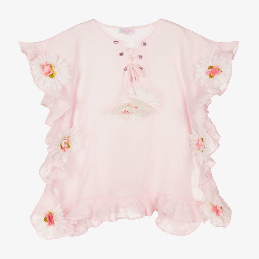 Gorgeous handmade pale pink beach kaftan for girls by Selini Action, exclusive to Childrensalon. Embellished with large ivory and pink floral appliqués, it is made in sheer cheesecloth, with sparkling pink gems edging the lace-up front.