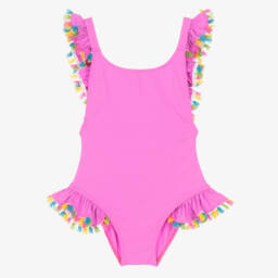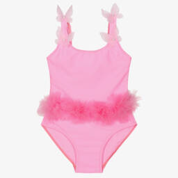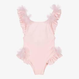 Super cute pale pink swimsuit for girls by Selini Acton, with a little teddy bear embellished with diamantés and a flower on the front. Handmade, it is soft, silky and stretchy, with ruffled detailing and tulle frills on the legs.