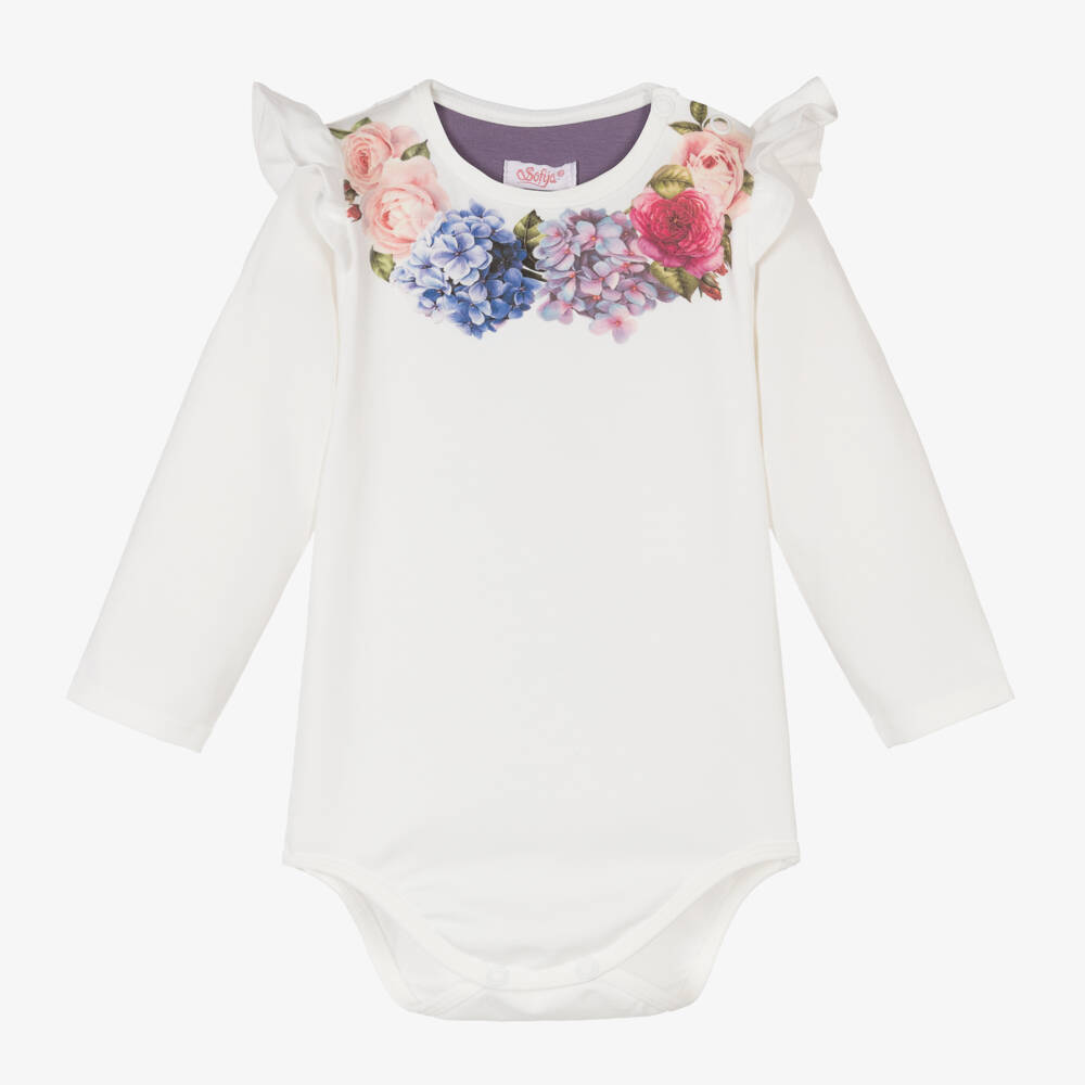 Feminine ivory cotton bodysuit for baby girls by classic Polish brand Sofiya, with a beautiful hydrangea and rose print around the neckline. Made in comfortable jersey, it has pretty ruffles over the shoulders and fastens with easy-to-use poppers on one shoulder and between the legs for speedy dressing.