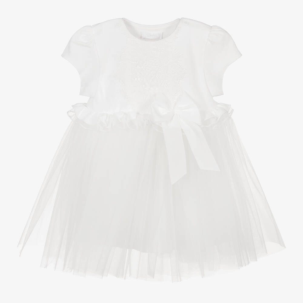 Ivory dress for baby girls, by Sofija. Made from soft cotton jersey, it has a white lace bodice with floaty ruffle sleeves. With a soft and lightweight lining, it has a ruffle waistband with a sweet fixed bow, and a pretty, layered tulle skirt.