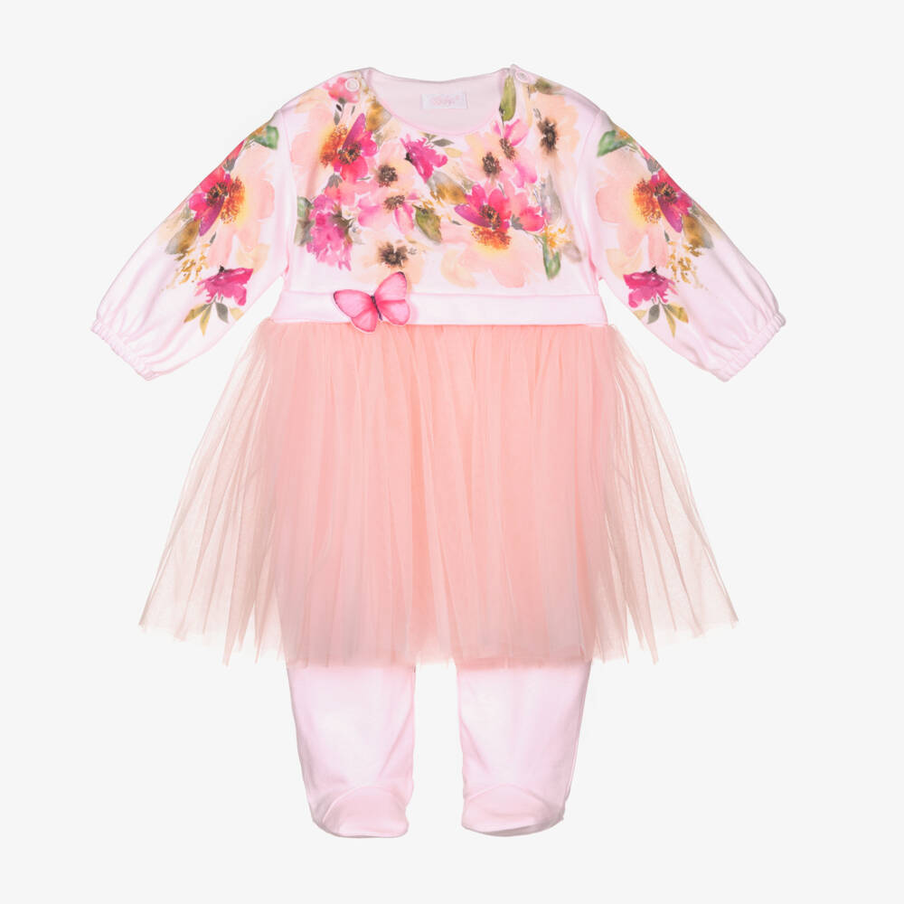 Pale pink babygrow for baby girls, by Sofija. Made from soft cotton jersey, the babygrow has a pink floral print on the top, with a gorgeous pink butterfly on the waistband. It has a lovely pink tulle skirt detail, and poppers between the legs and on the shoulders for easy dressing.