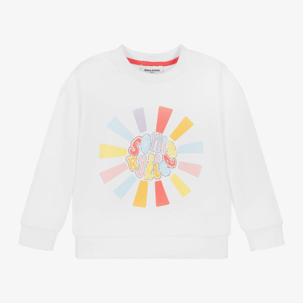 From Sonia Rykiel Paris, a white cotton sweatshirt for girls. Comfortable and casual, it is made in mid-weight jersey with an oversized fit, long sleeves and ribbed trims. Adding bold pops of colour and signature designer appeal, it is printed with a colourful sun logo design, trimmed with sparkly diamantés.