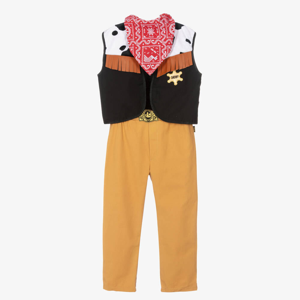 Fun sheriff dressing-up costume for boys by Souza, woven in a soft cotton blend. Transform your child into a sheriff straight from their imagination in this cool costume, completed with a red tie-up bandana. It comes with a black, cow print waistcoat with a sheriff badge appliqué and tan brown tassels. The beige trousers have a comfortable elasticated waist for comfort, finished with a woven gold belt badge appliqué on the waist.