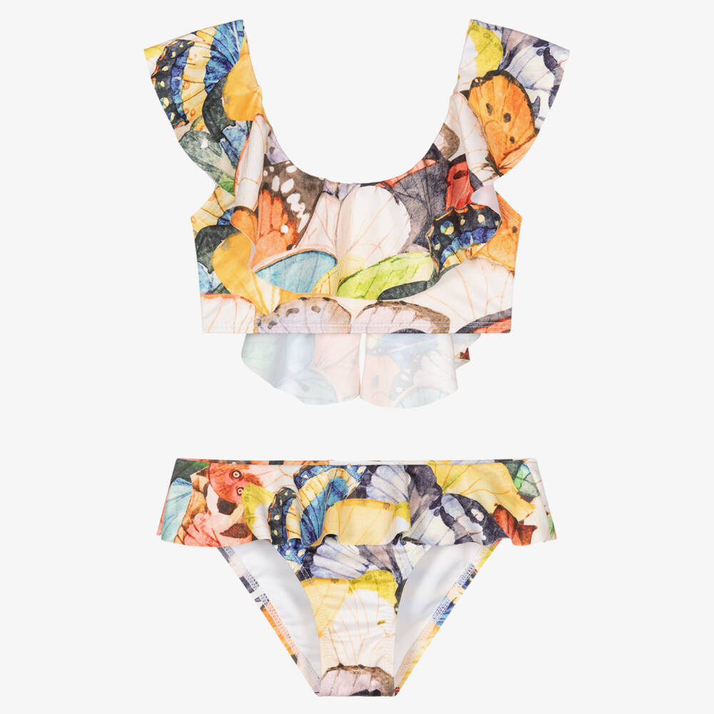 A gorgeous orange bikini for girls by Stella Cove, patterned with colourful butterflies and ruffled trims. Smooth and stretchy with a soft lining, this bikini has a hook fastening on the back for simplistic and effortless wear.