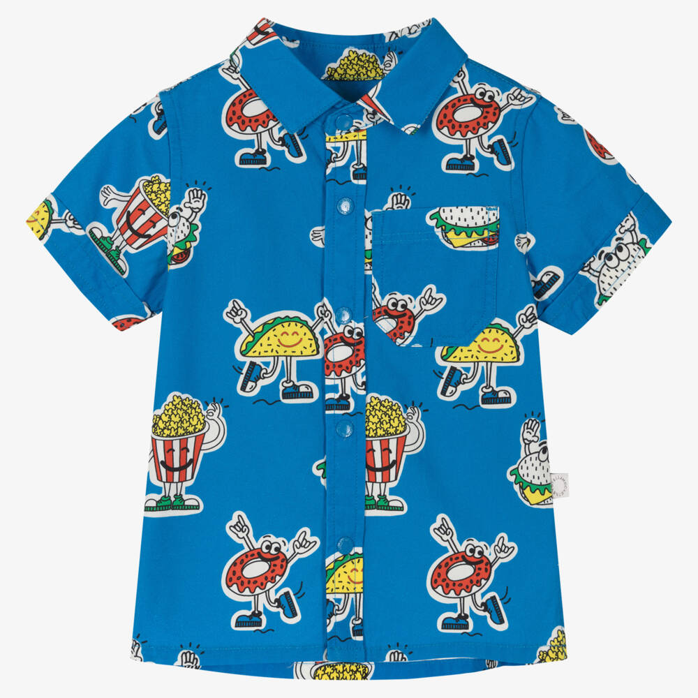 Bright blue shirt for baby boys by Stella McCartney Kids, with a colourful 'fast-food' character print. Made in lightweight cotton poplin, this cool short-sleeved style has a chest pocket and branded popper fastenings for easy dressing. The Stella McCartney fit can be quite small so choose a size up if you want room to grow.