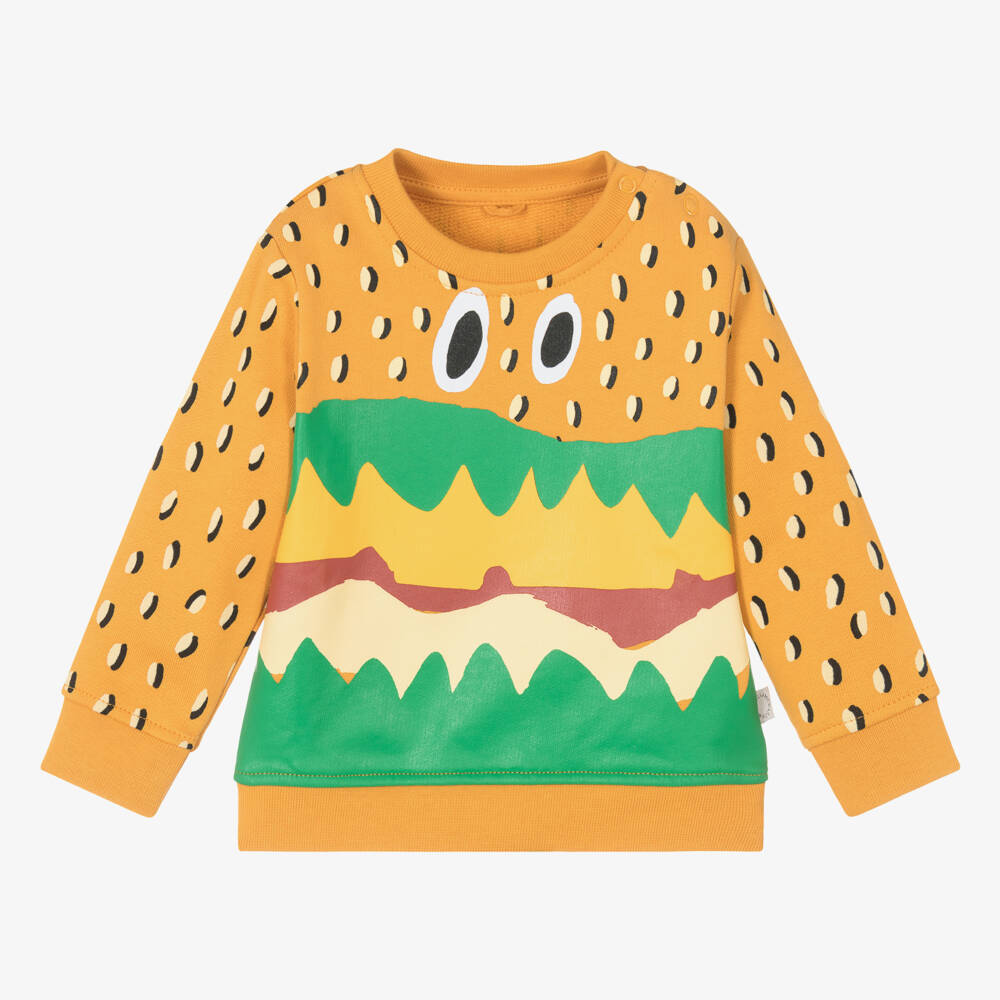 Playful orange sweatshirt for baby boys, by Stella McCartney Kids. Made in soft organic cotton jersey, this long-sleeved sweatshirt has a delicious, quirky sandwich print on the front and back. It fastens with discreet poppers on one shoulder to help with easy dressing. The Stella McCartney fit can be quite small so choose a size up if you want room to grow.